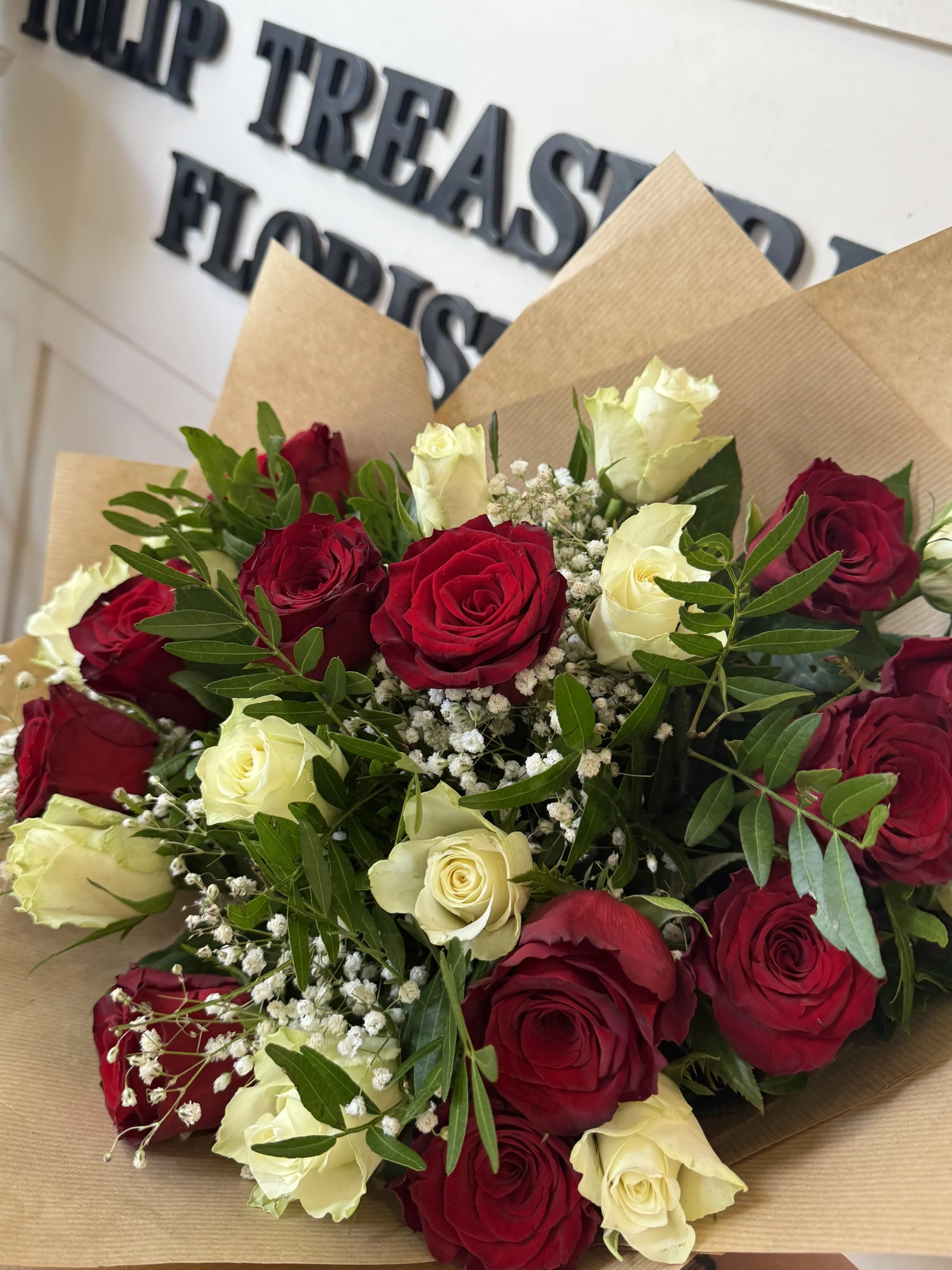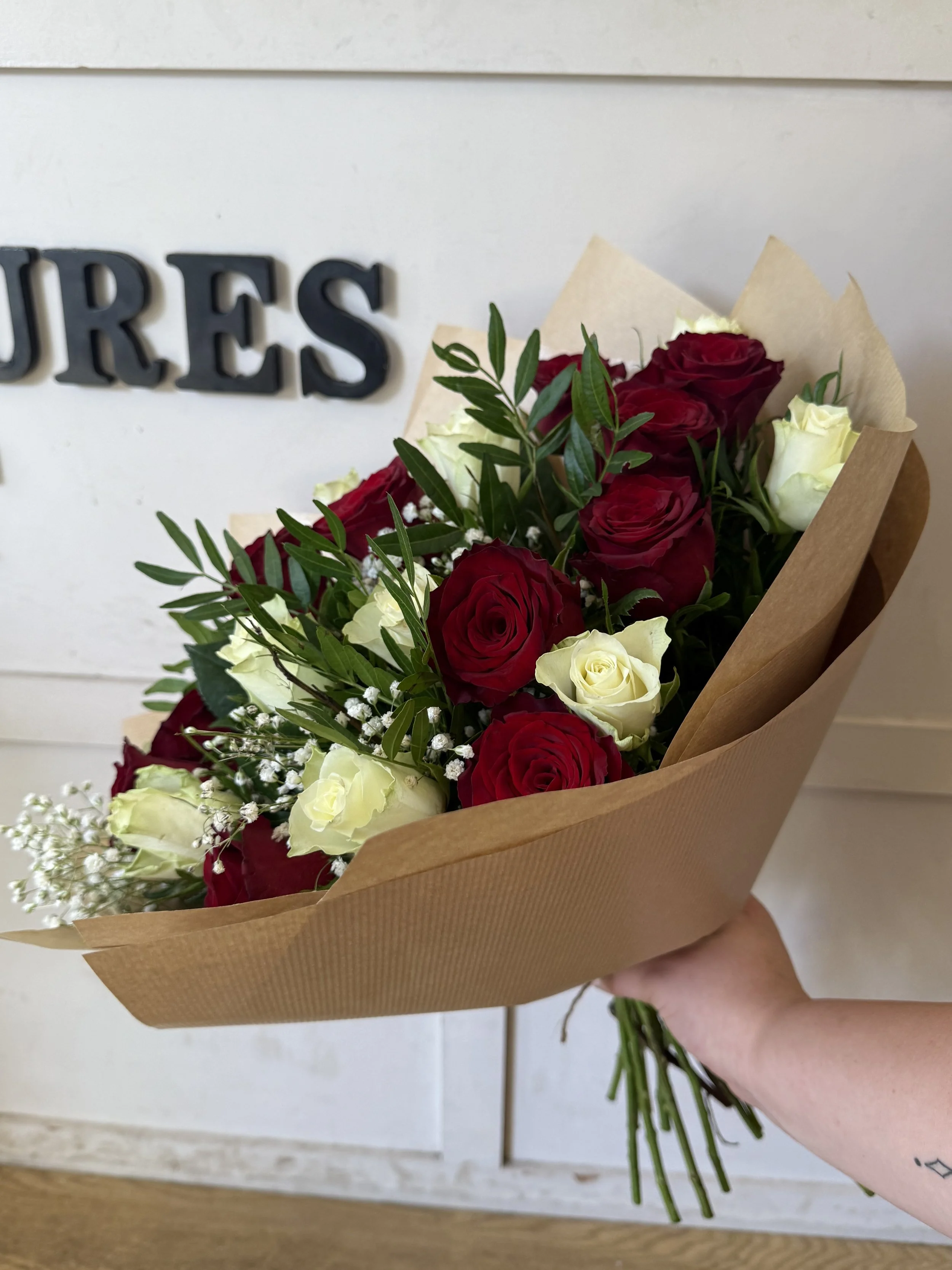 This Red and White Rose with Gypsophila Hand Tied is out of water, ready to put in a vase. just select how many roses you would like to gift.