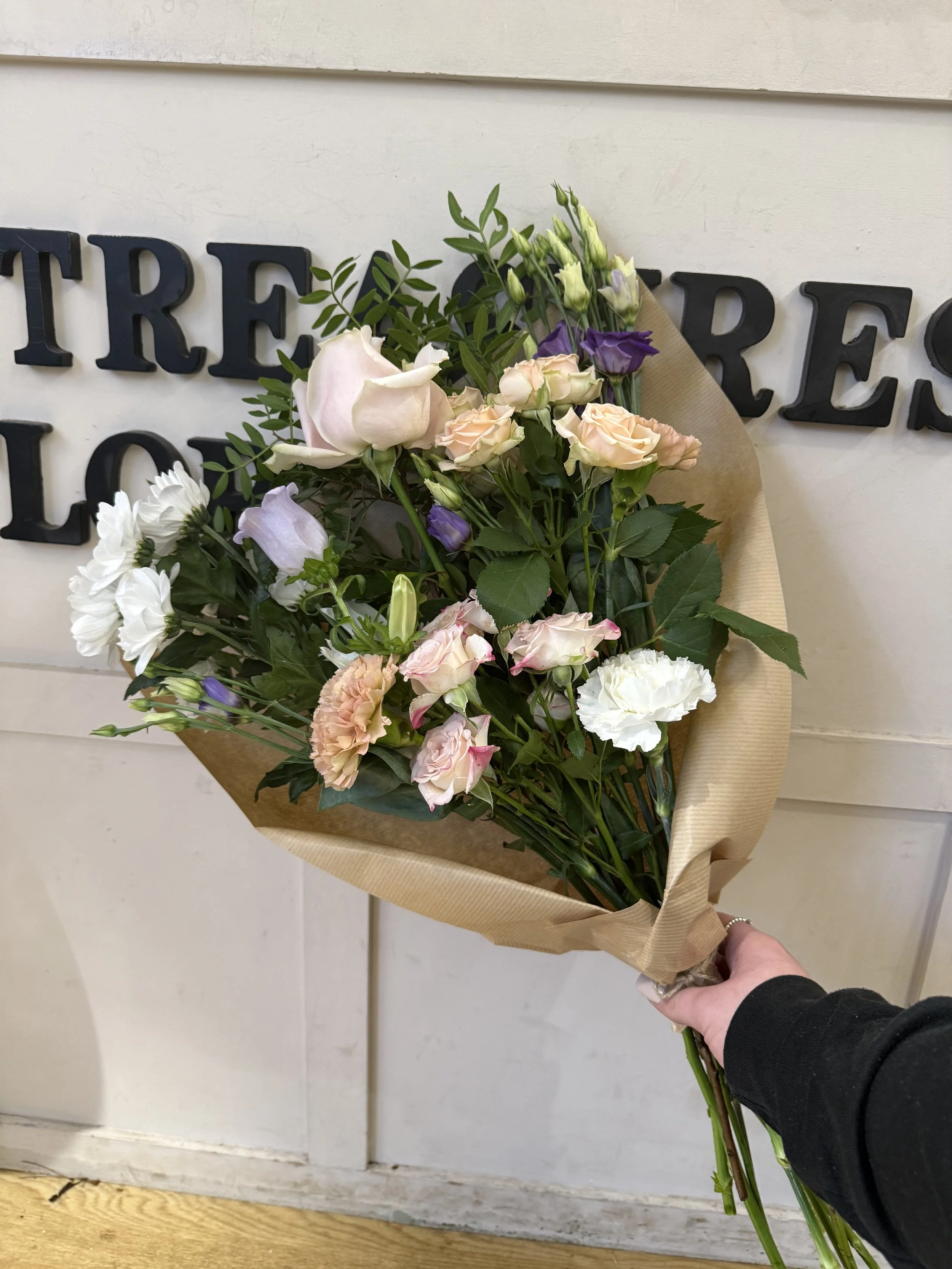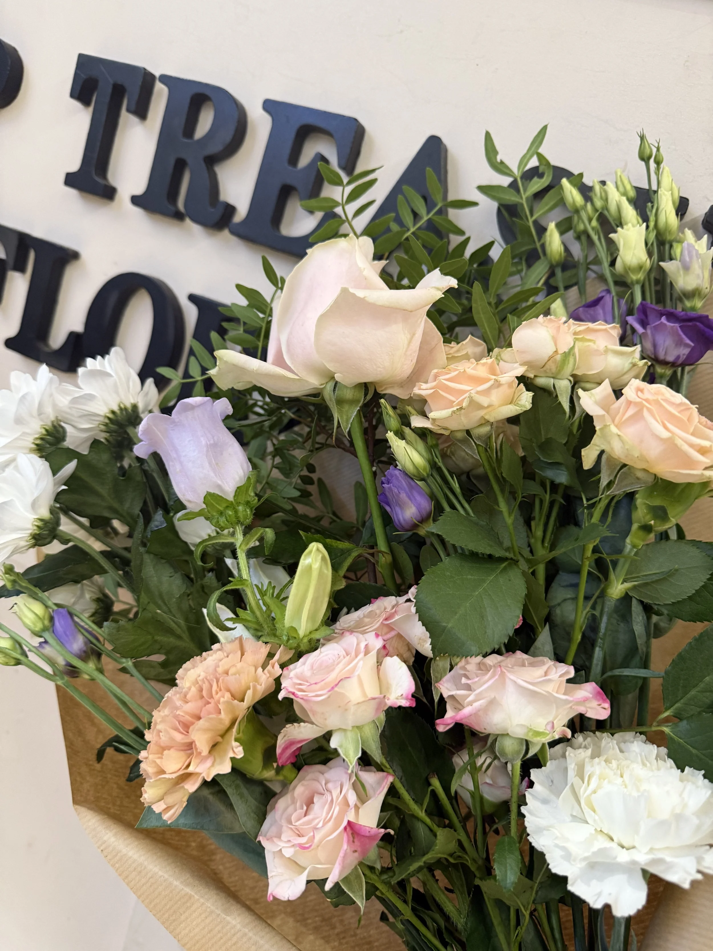 This Raspberry Rush Flat Bouquet includes, raspberry, pink, purple and blue blooms. This Flat Bouquet is out of water perfect to put in a vase.